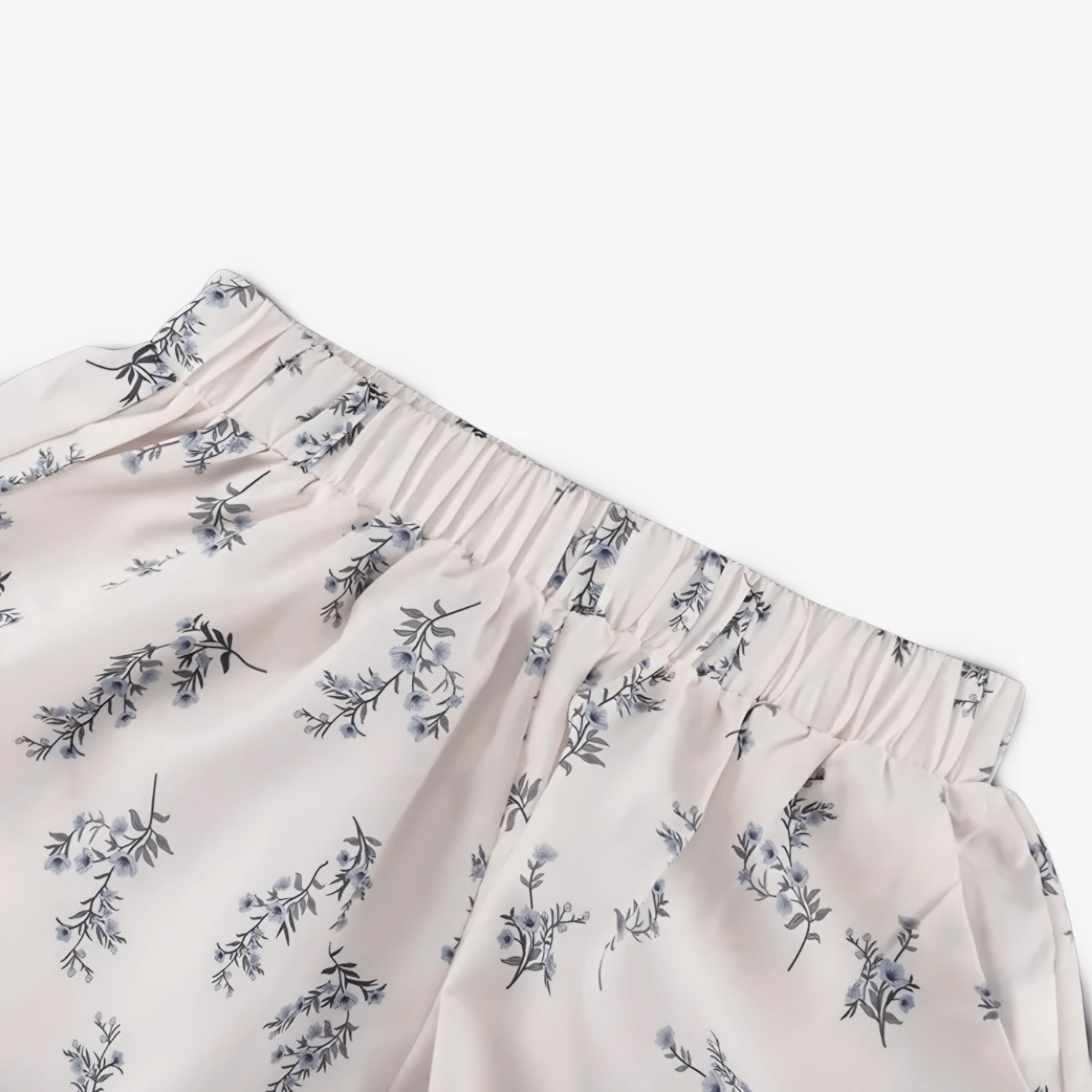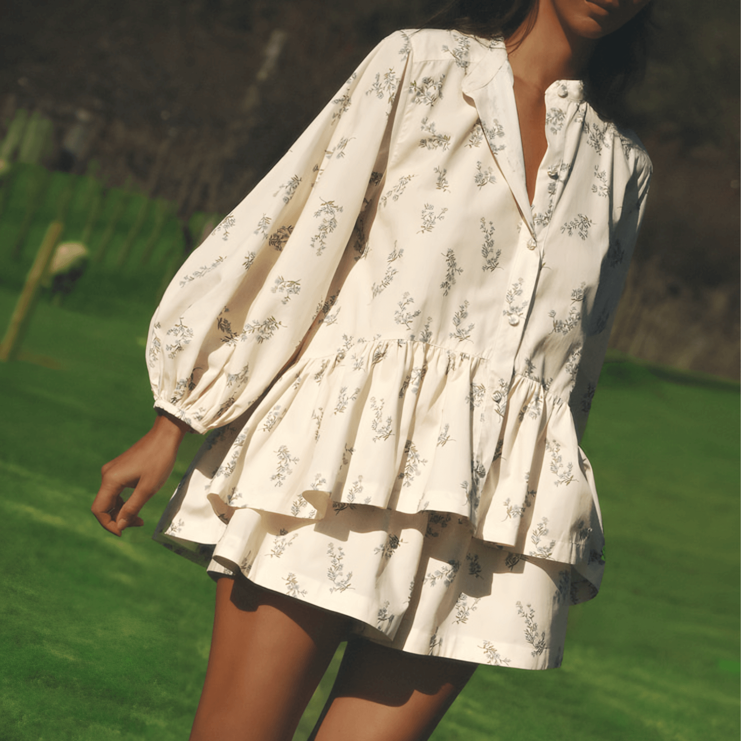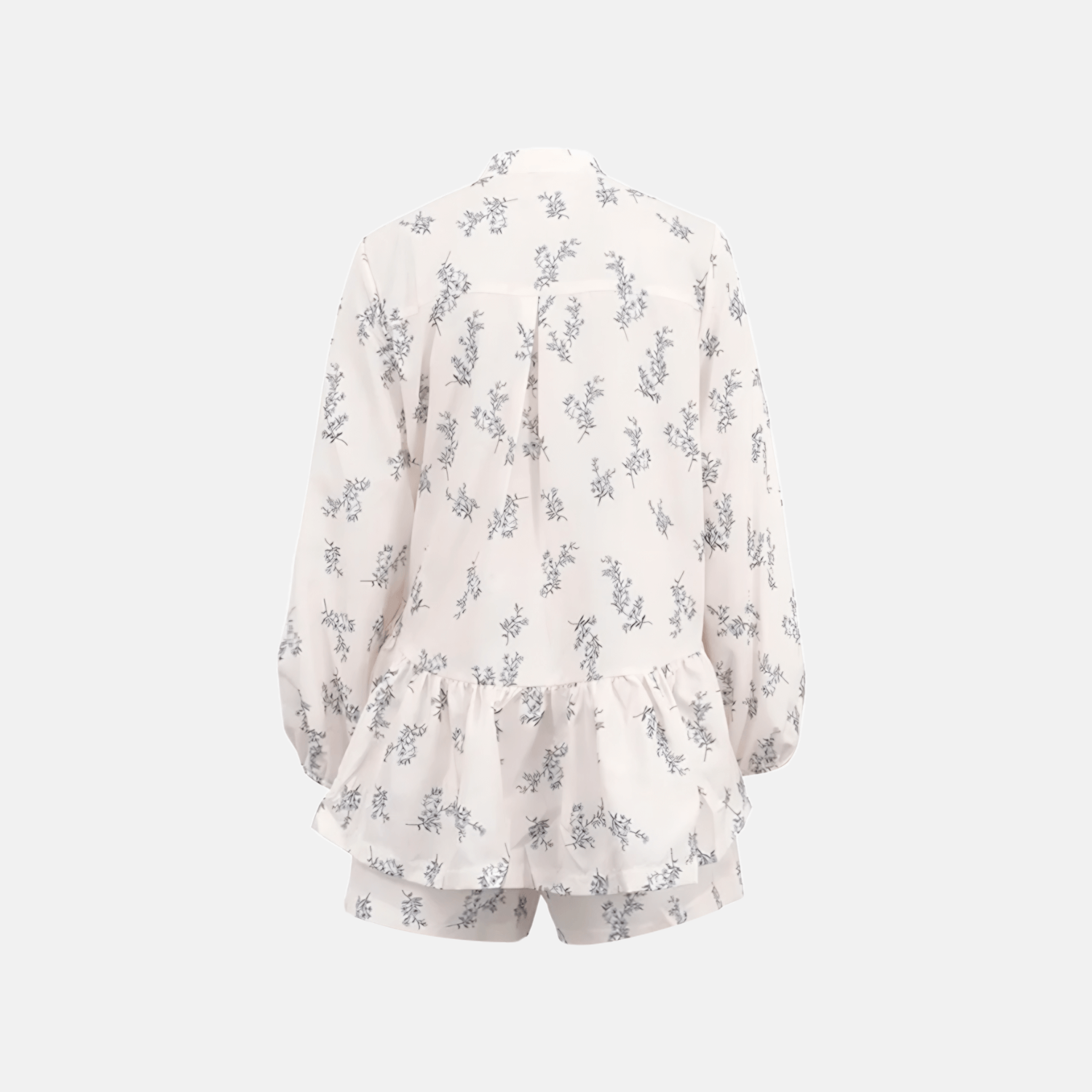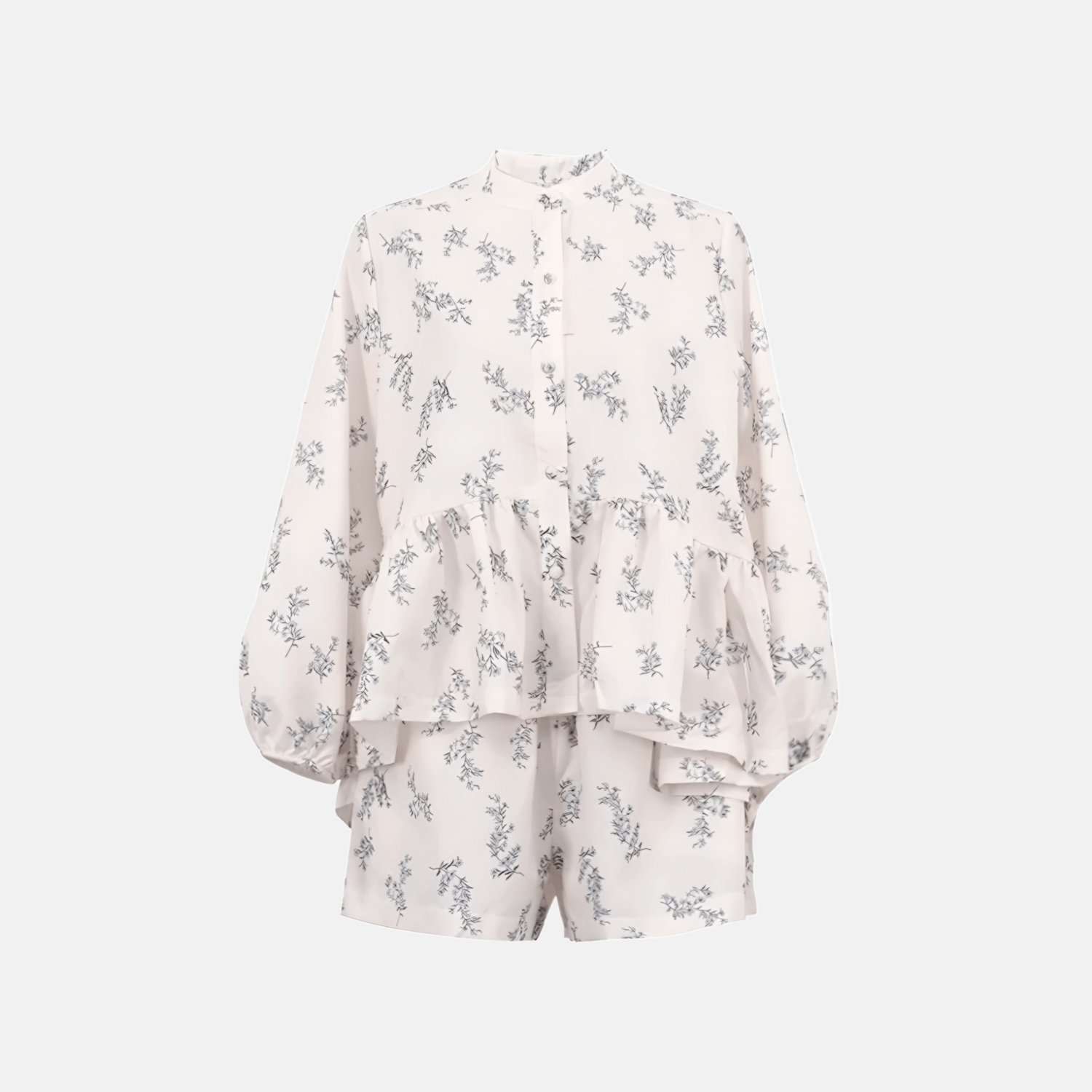 Blouse with puffed sleeves and elastic cuffs. V-neck with front button closure. Layered peplum detail. High-waist shorts with adjustable elastic. Delicate floral print.