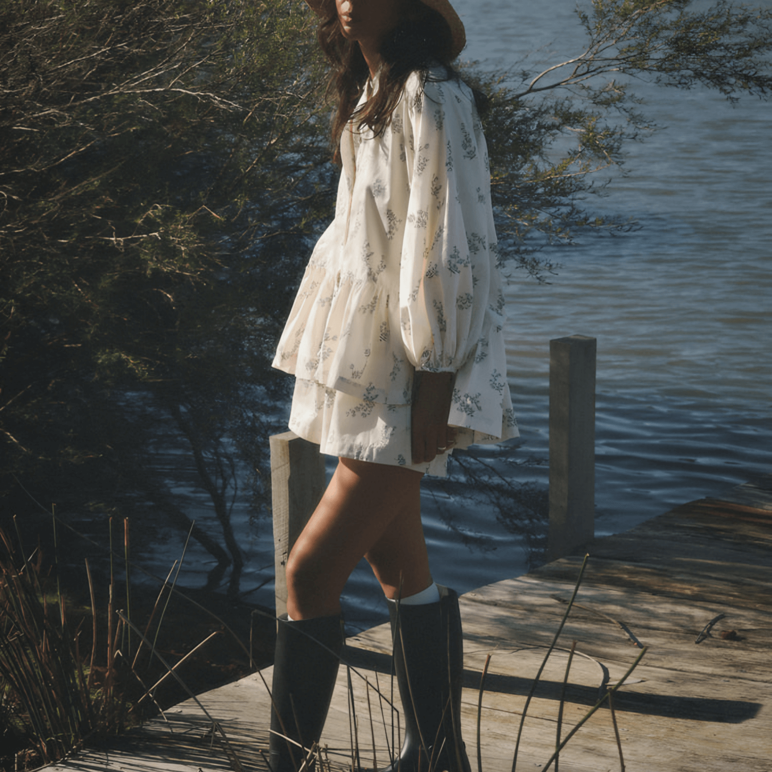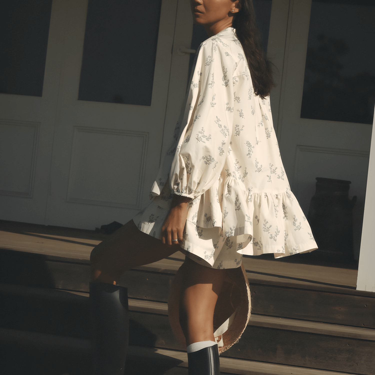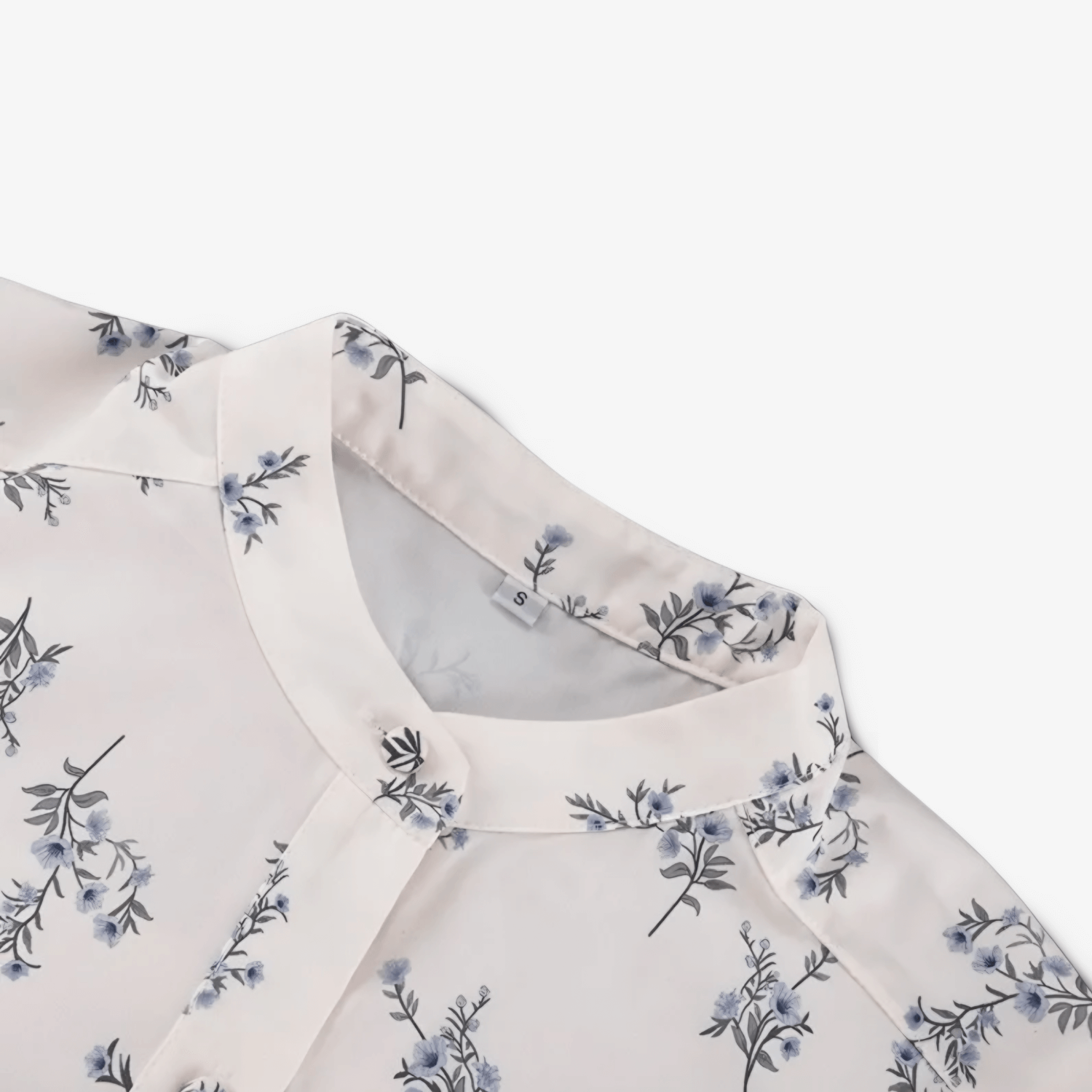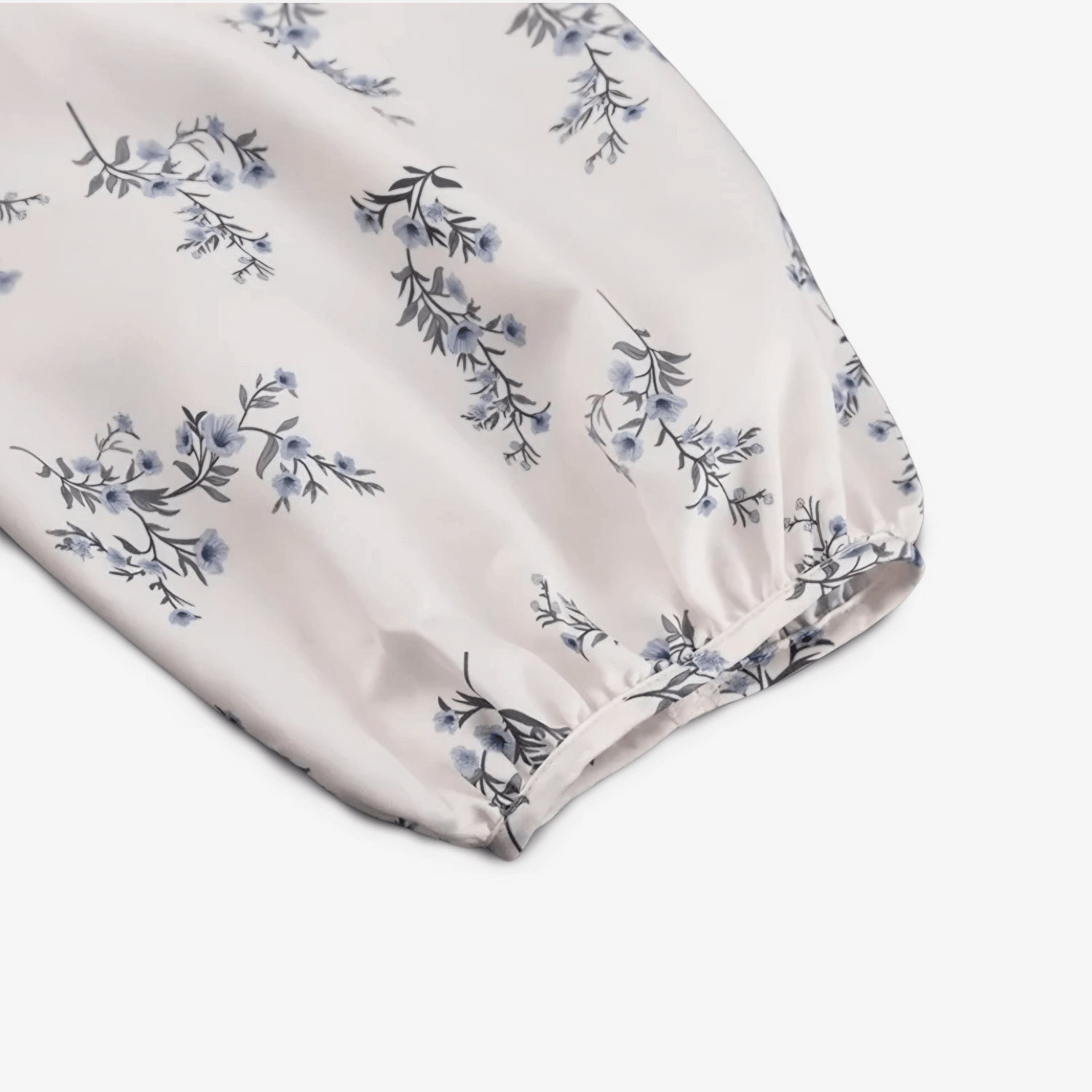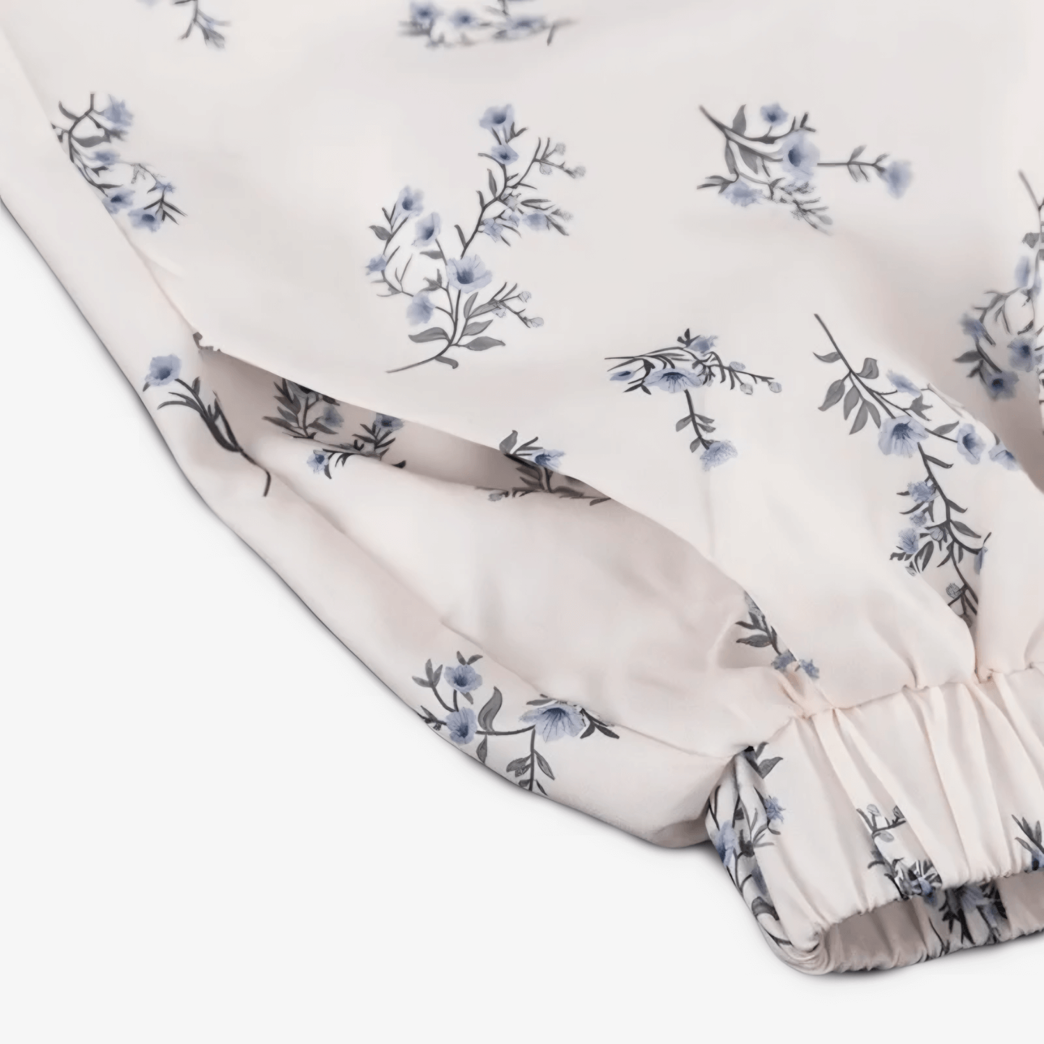 Blouse with puffed sleeves and elastic cuffs. V-neck with front button closure. Layered peplum detail. High-waist shorts with adjustable elastic. Delicate floral print.