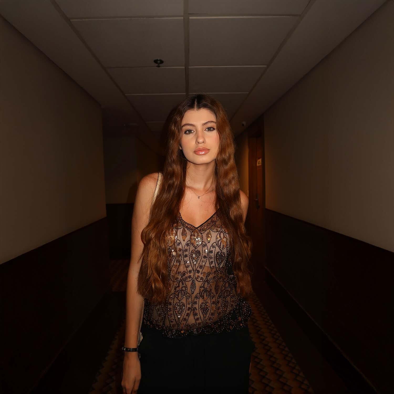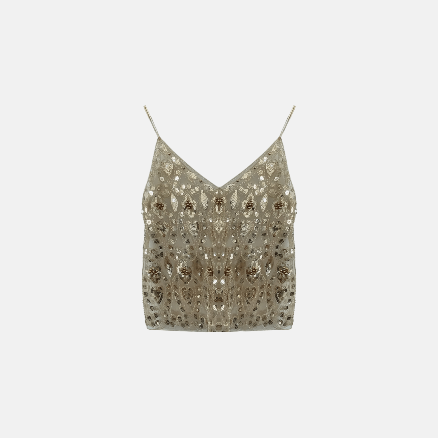 Spaghetti strap top with V-neckline, adorned with sequins and delicate gemstones. Refined finish with a loose fit.
