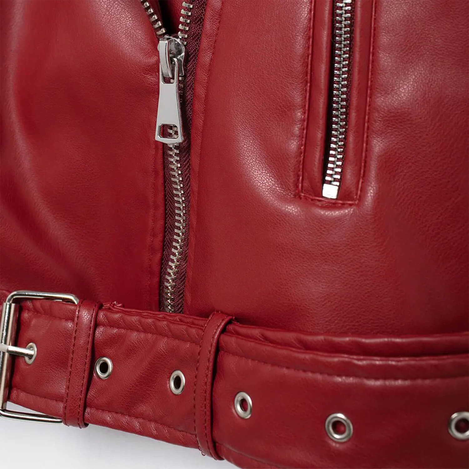 Cropped biker jacket with lapel collar and crossed front closure with metal zipper. Front zip pockets. Belt detail with buckle and eyelets at the hem. Decorative buttoned shoulders. Lined structure with smooth texture finish.