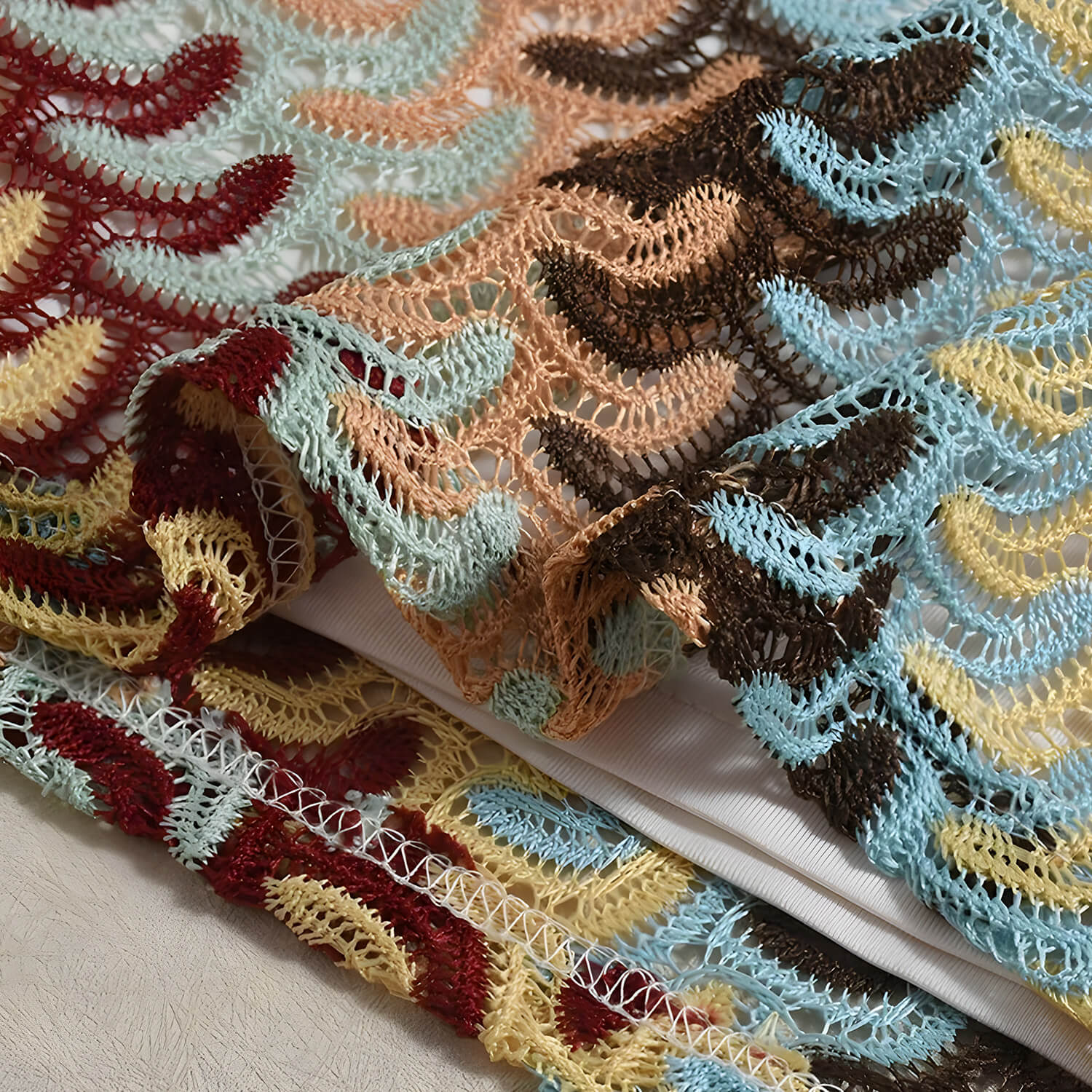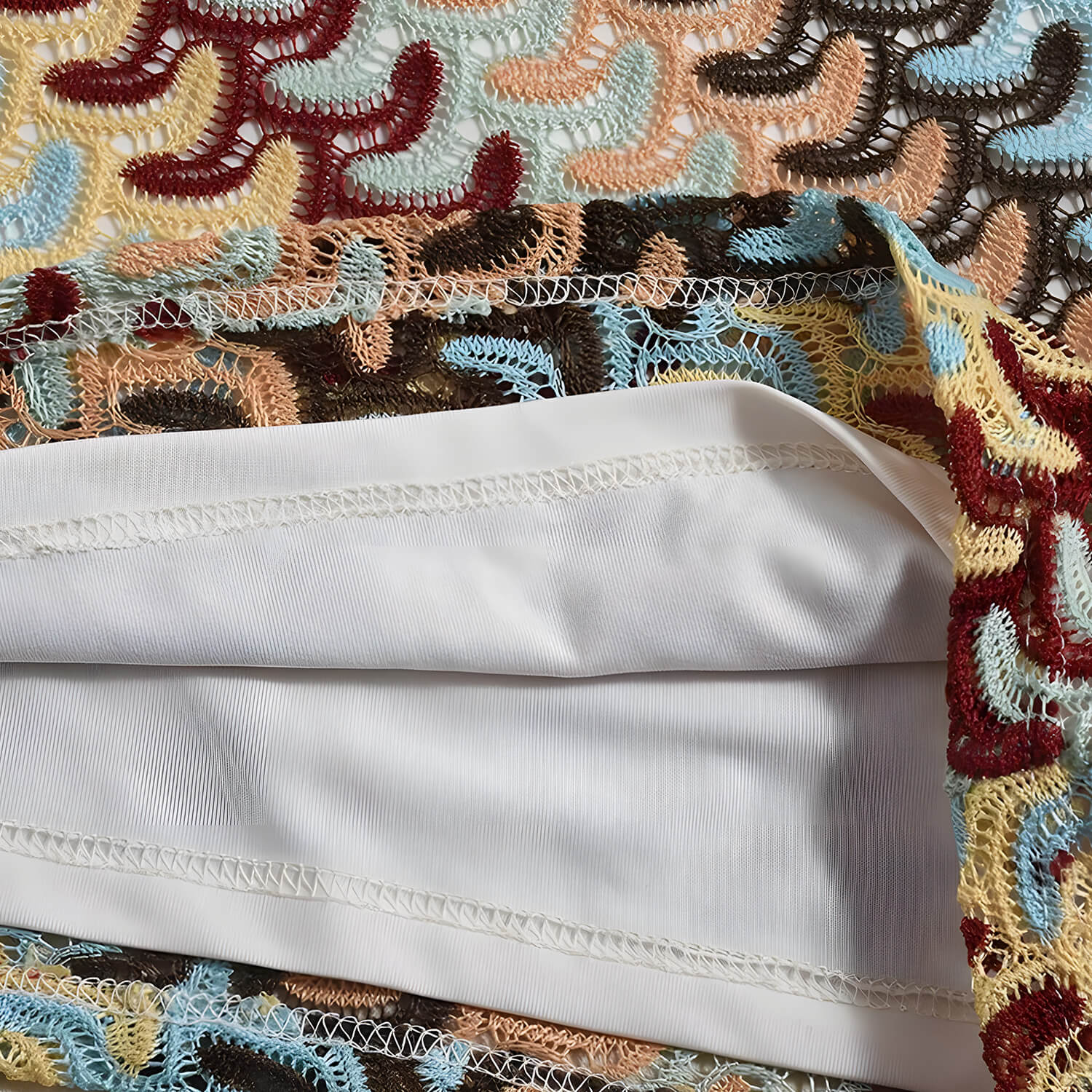Short one-shoulder dress with a fitted silhouette. Colored lace with wave pattern and partial transparency. Built-in lining and internal finish with elastic seam.